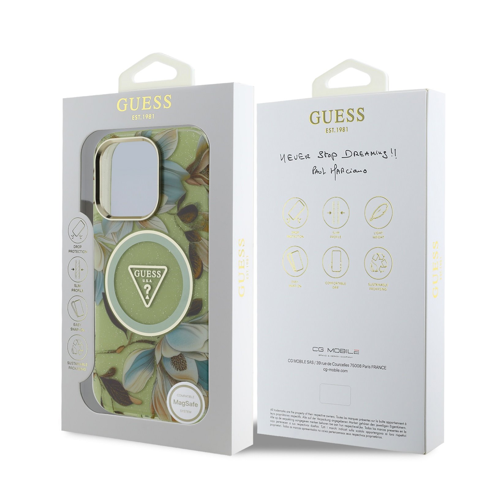 Калъф от Guess IML Glitter Magnolia and Triangle Logo MagSafe Case for iPhone 16 Pro Green
