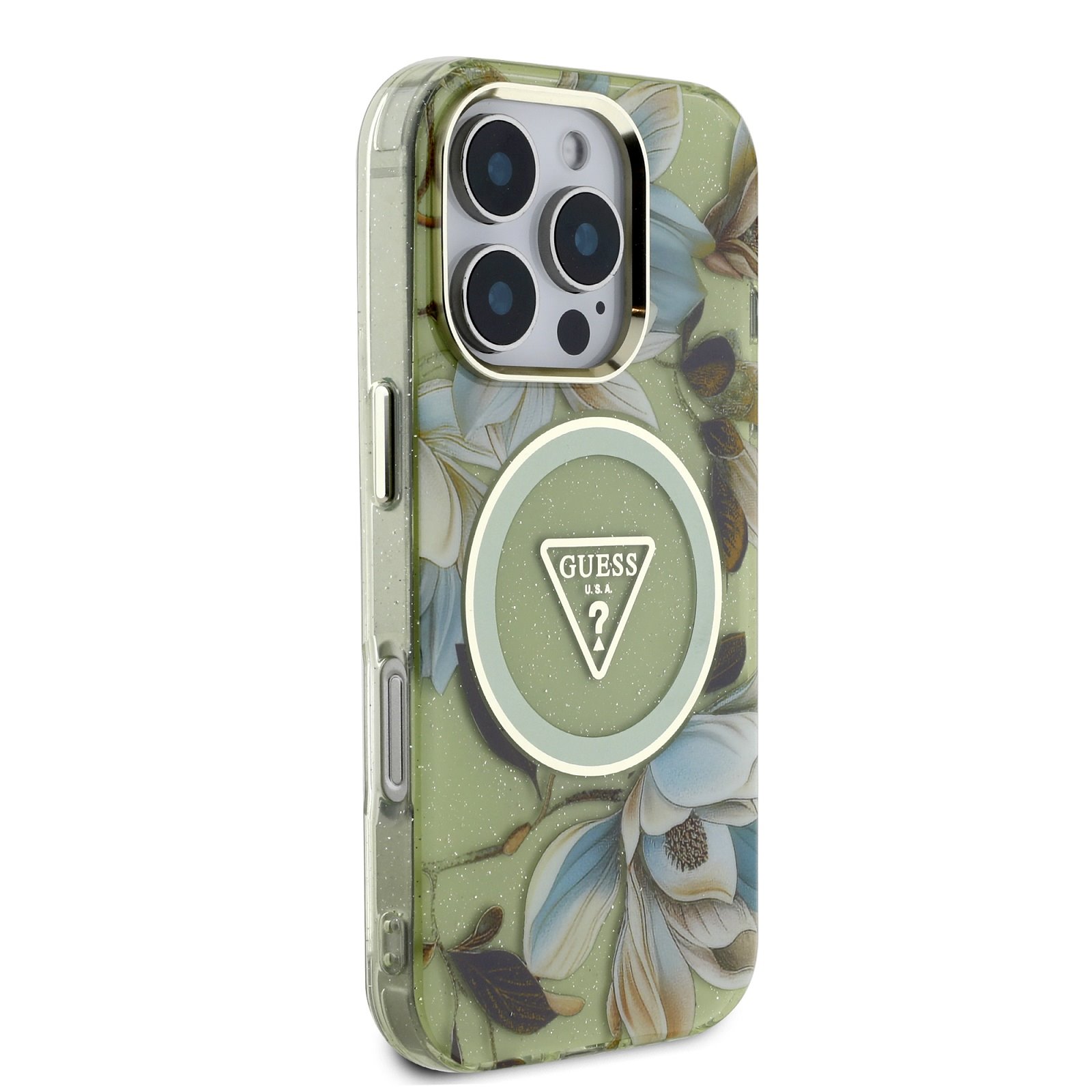 Калъф от Guess IML Glitter Magnolia and Triangle Logo MagSafe Case for iPhone 16 Pro Max Green