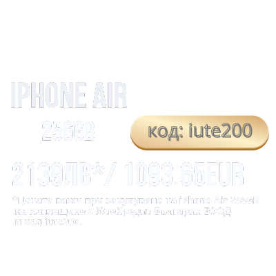 iPhone Air. Най-тънкият iPhone. 6,5 инчов дисплей, здрав преден панел и заден панел Ceramic Shield, чип A19 Pro, 48 MP Fusion камера система и централна сцена предна камера.